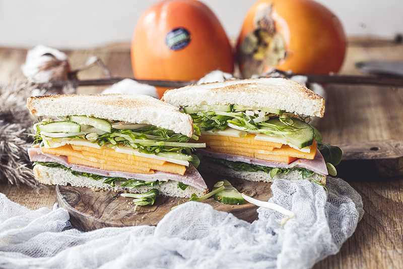 Toastový chléb opečte z obou stran na sucho na pánvi. Potom ho lehce namažte máslem. Přidejte polníček, šunku, na tenké plátky nakrájené kaki a oblíbený sýr. Další vrstvou sendviče bude řeřicha, klíčky mungo nebo výhonky hrášku, prostě cokoli máte rádi. Nakonec navrstvěte okurku a rajče. Druhý plátek chleba namažte trochou majonézy, přiklopte a sendvič je hotový.