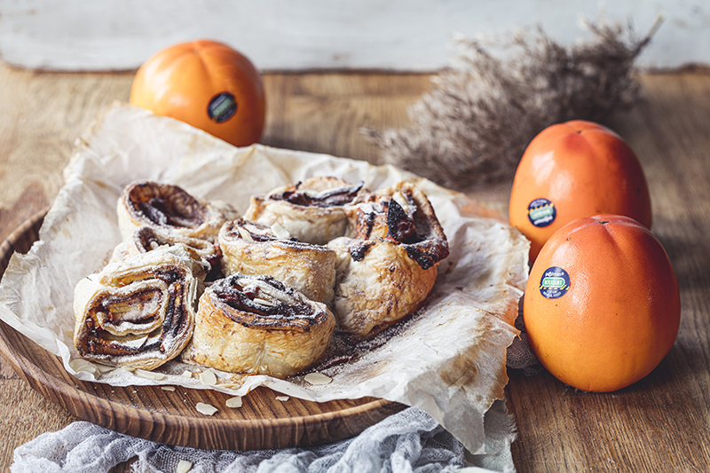 Troubu rozehřejte na 200 stupňů. Listové těsto rozválejte na tenký plát, posypejte skořicí a poté třtinovým cukrem. Kaki nakrájejte na co nejtenčí plátky a postupně naskládejte na těsto. Zatočte do závinu. Pekáček vyložte pečicím papírem. Závin nakrájejte na zhruba 5cm pruhy, které naskládejte vedle sebe do pekáčku. Potřete rozšlehaným vejcem a vložte do předem vyhřáté trouby. Nechte péct zhruba 30 minut, dokud okraje šneků nezezlátnou. Po vychladnutí šneky přelijte trochou rozpuštěného másla.