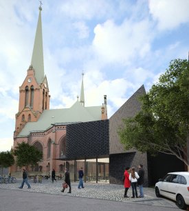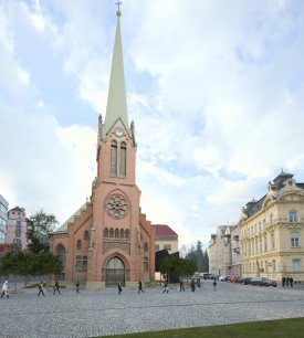 „V projektu stavebních úprav Červeného kostela se snažíme umístit novou hmotu do místa mezi kostel a budovu ředitelství a ztvárnit nový objekt tak, aby nepůsobil arogantním dojmem. Naopak by se měl stát důstojným doplňkem kostela. Musí být čitelné, že se jedná o nový objekt – o moderní soudobou stavbu, která přebírá určité typické prvky z historické budovy (jako je třeba členitost hmoty) a v soudobé formě je uplatňuje na nové budově. Novostavba bude propojena s kostelem přes skleněný tubus, který bude zaústěn přes stávající zadní vstup do hlavní lodi kostela. Objemová rozmanitost i půdorysná zalamování nové hmoty reagují na ostré členité tvary neogotiky Červeného kostela. Samozřejmě na projektu dále pracujeme, hledáme nejlepší možné řešení – projekt se neustále vyvíjí. V aktuální fázi studie je naším hlavním úkolem přesvědčit orgány státní správy o správnosti – ani ne tohoto konkrétního návrhu, ale o správnosti cesty. O správnosti směru, kterým se vydáváme. Navržený koncept se stále modifikuje, modeluje, upravuje, abychom v určitém stádiu mohli říct: ,Tohle je dobré!‘“