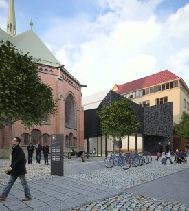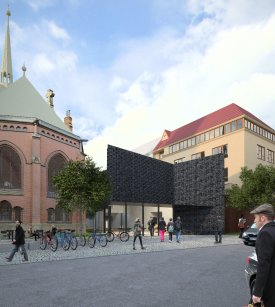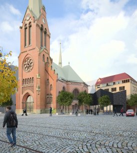 „Tím podstatným bude vždy kostel jako takový a nový objekt by měl být kvalitním citlivým doplňkem. Zazněla řada názorů, že by nový objekt měl být nejlépe neviditelný a nenápadný, aby nekonkuroval stavbě kostela. Dokonce existuje představa, že by měl být umístěn pod úrovní terénu. To ale není možné – pod zemí se zde totiž nachází zbytky původního opevnění města Olomouce,“ vysvětluje Miroslav Pospíšil a ukazuje nám vizualizace projektu stavebních úprav Červeného kostela. „Nový objekt by rozhodně neměl být jen technickou krabicí, která se bude krčit někde vzadu, ale důstojným partnerem– byť v méně objemné podobě. Měl by žít v jakési symbióze jak s kostelem, tak i s budovou ředitelství Vědecké knihovny, která stojí za kostelem od roku 2000.“