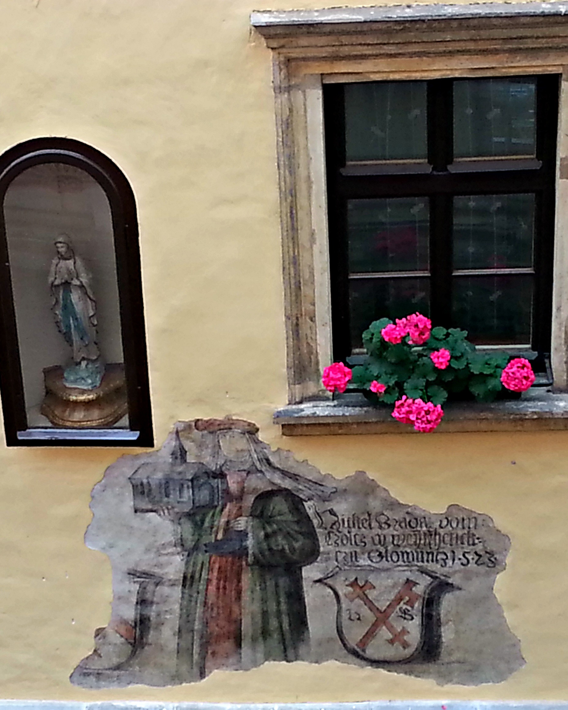 Freska na fasádě pochází z počátku 16. století. Stylově jde ještě spíše o pozdní gotiku, byť odkrytá postava na obraze se chlubí již módním renesančním oděvem. „Pozdní gotika v umění u nás doznívala až do 50. let 16. století,“ říká akademický malíř a restaurátor Radomír Surma. „Museli jsme očistit povrch a odstranit novodobou přemalbu, jednu lazurní scelující a další starší vápennou přemalbu, až jsme odkryli skutečný originál z roku 1523,“ popisuje práci restaurátor. „Díky tomu se objevily i některé prvky, které dříve vidět nebyly, jako je třeba model gotického kostelíku, který drží ženská postava v ruce. Dále se pod přemalbami objevil honosný teplý tehdy módní zeleně sametový oděv s teplou podšívkou a na levé ruce postavy zásnubní prsten. Také se podařilo identifikovat část obličeje postavy, hrozen vína, nebo fragmenty písma.“ Právě s těmito fragmenty nápisu pak musel pomoct další odborník, a to historik a paleograf Bohdan Kaňák. „Díky schopnostem pana Surmy a mým znalostem písma jsme postupně ten nápis rozluštili. Pokud jde o typ písma, jedná se o frakturu, přesněji o německé novogotické ručně kreslené písmo,“ upřesňuje doktor Kaňák. Na fresce byl postupně rozluštěn tento nápis ve třech řádcích: