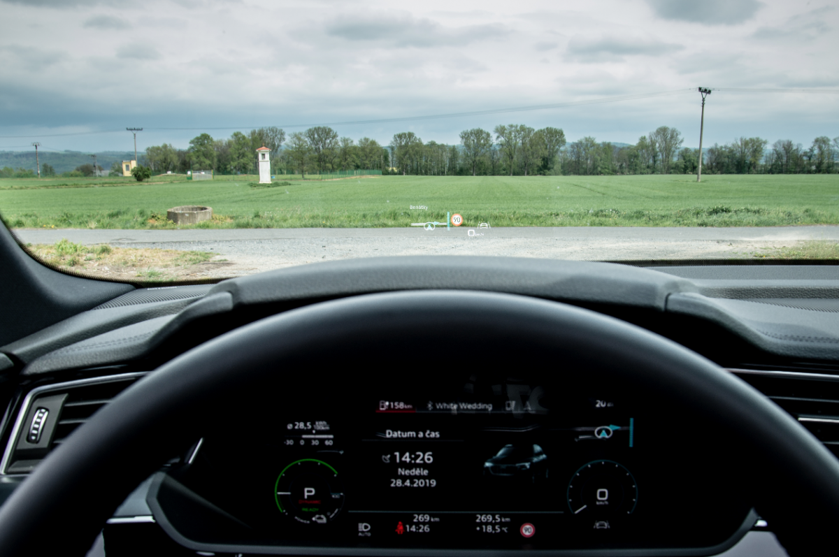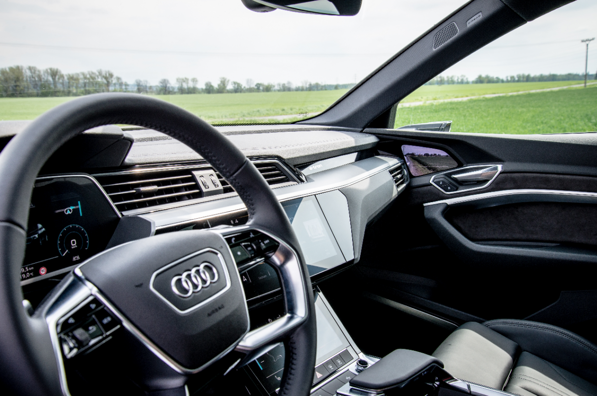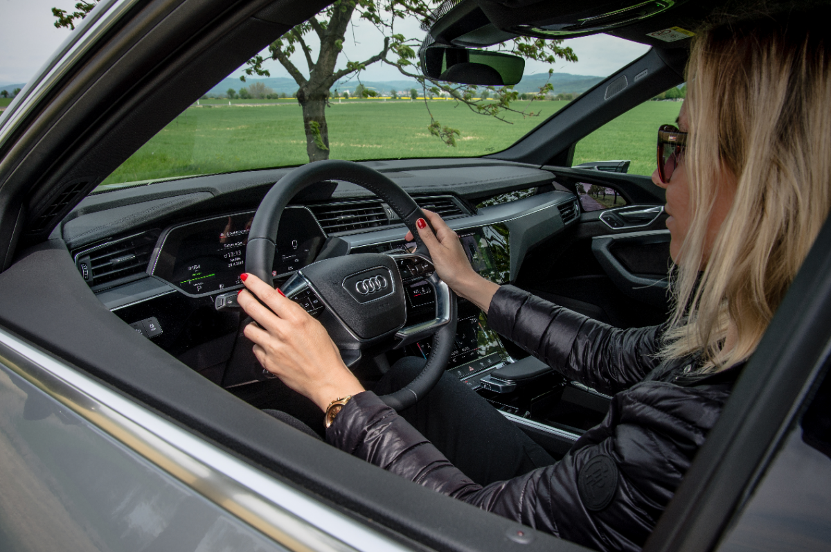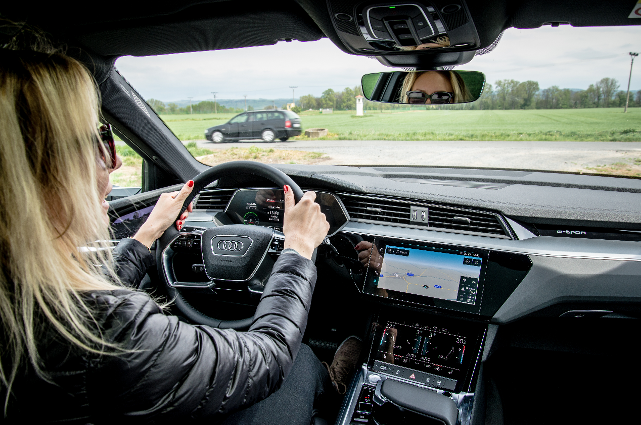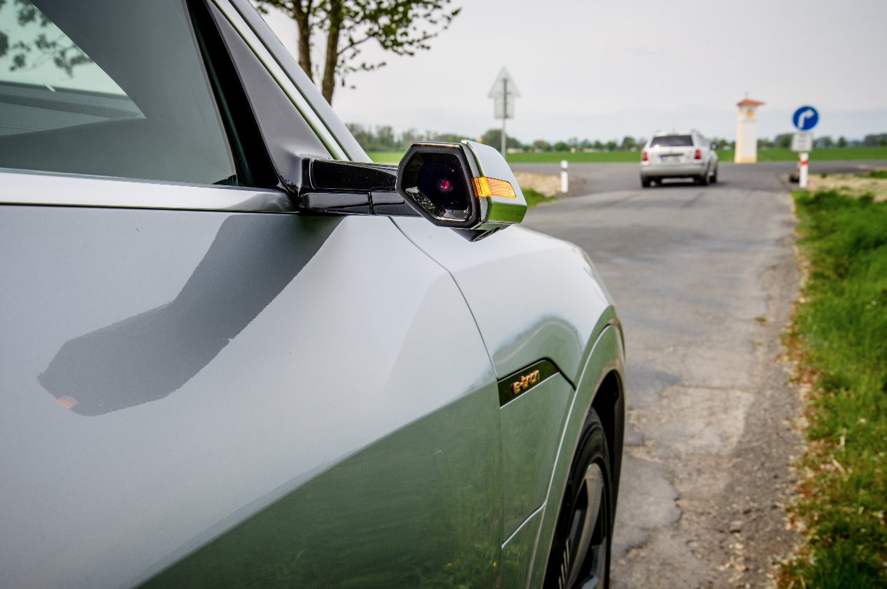 Do e-tronu jsem se zamilovala ještě dřív, než jsem si do něj sedla. Virtuální vnější zrcátka dělají z tohoto vozu téměř nadpozemský přístroj. Audi e-tron je prvním sériově vyráběným modelem, který je virtuálními vnějšími zpětnými zrcátky vybaven. Ta nabízí nejen nový technologický zážitek, ale také celou řadu praktických výhod ve smyslu komfortu a bezpečnosti. Na jejich plochých stopkách jsou posazena šestihranná zakončení, ve kterých jsou integrovány malé kamery. Obraz zachycený těmito kamerami se zobrazuje na vysoce kontrastních OLED displejích o rozlišení 1200 x 800 pixelů, které jsou umístěny mezi palubní deskou a dveřmi.