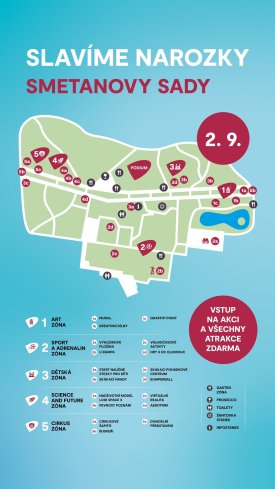 Na sobotu 2. září je od 10 do 19 hodin připraven mix zábavy, adrenalinu i poznání pro celé rodiny a lidi všech generací. Připraveny budou Future & science zóna, Sportovní a adrenalinová zóna, Art zóna, Dětská zóna, Hudební zóna s pódiem a konečně také Cirkusový a divadelní point. Mezi hlavními body jsou i další místa s muzikanty a jinou zábavou či dobrotami.