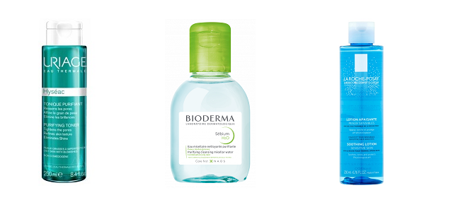 Uriage Hyséac čisticí tonikum; Bioderma Sébium H2O; La Roche-Posay Physiologique