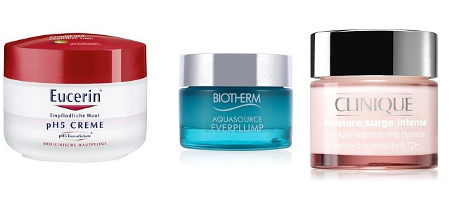 Hydratační krém Eucerin pH5; BIOTHERM AQUASOURCE EVERPLUMP; Clinique Moisture Surge 72 Hour