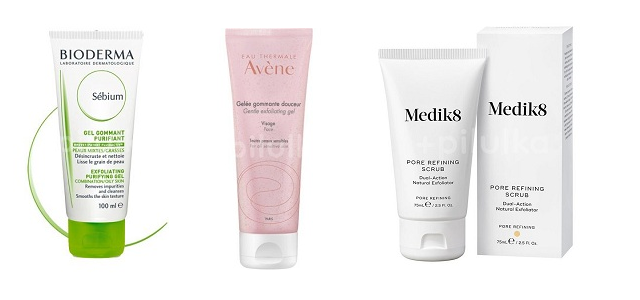 Bioderma Sébium peelingový gel;  Avène Skin Care; MEDIK8 Pore Refining Scrub