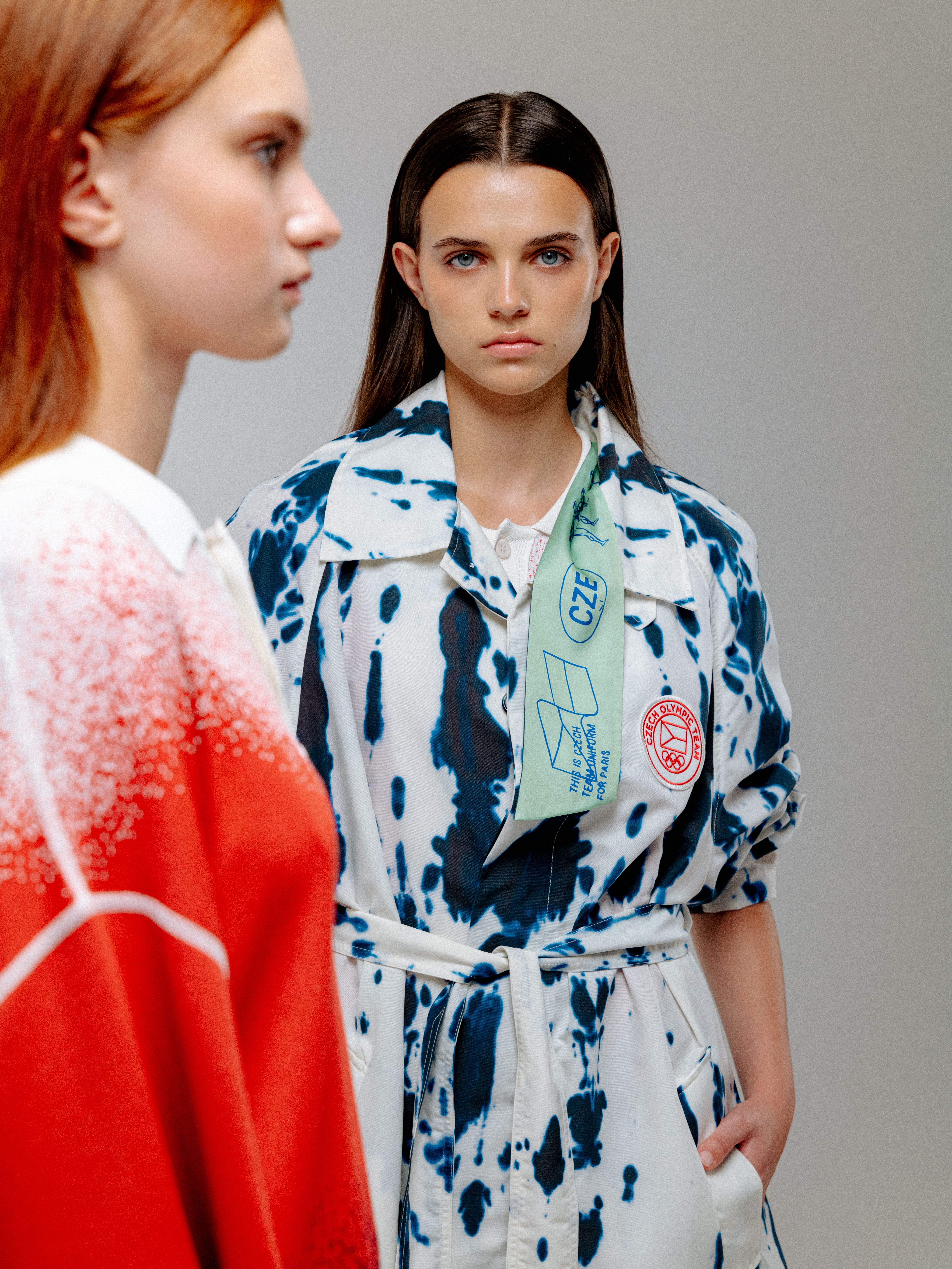 Dominantním prvkem celého outfitu je oversized trenčkot plášť v bílo-modré kombinaci z japonského nylonu. Tento plášť je doplněn pletenou sadou, která návrháři evokuje staré zlaté časy elegance ve sportu. Obsahuje polo triko a kalhoty s puky. Černý posunul barevné spektrum českého trikoloru a namíchal vlastní odstíny, na oblečení se tak objevuje tmavě modrá, smetanová a jasná červená. Pro oživení celého outfitu přidal tyrkysové šátky a ponožky.