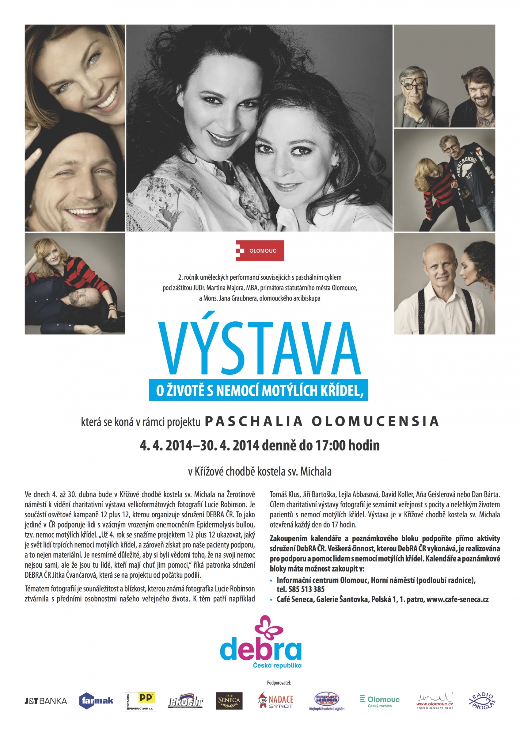 Dnes ve 13:00 hodin byla v Křížové chodbě kostela sv. Michala na Žerotínově náměstí slavnostně zahájena charitativní výstava velkoformátových fotografií Lucie Robinson. Je součástí osvětové kampaně „12 plus 12“, kterou organizuje sdružení DebRA ČR. To jako jediné v ČR podporuje lidi s vzácným vrozeným onemocněním Epidermolysis bullou, tzv. nemoc motýlích křídel. Patronkou sdružení DebRA ČR je herečka Jitka Čvančarová, která se zúčastnila i olomoucké vernisáže společně s dalšími významnými hosty.
