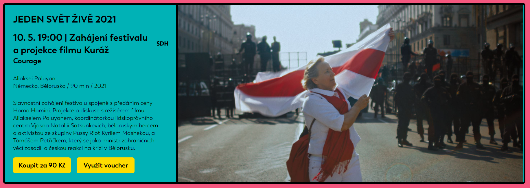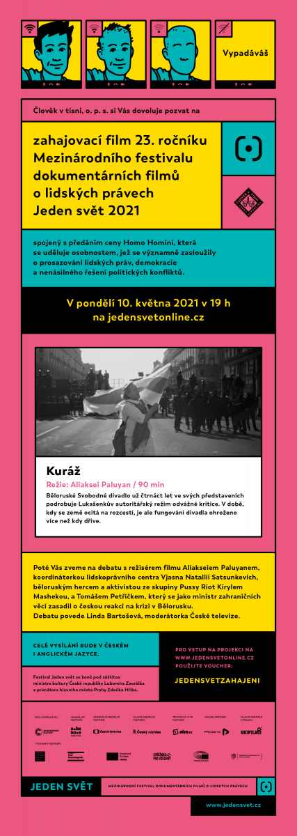 Festival bude slavnostně zahájen v pondělí 10. května v 19:00 běloruským snímkem Kuráž na webu jedensvetonline.cz, který diváky presune do prostředí nedávných demonstrací v Minsku. Poté se až do 19. května bude web festivalu plnit živými streamy vybraných filmů a odbornými diskusemi. Stačí si jen přímo na webu zakoupit online vstupenku, připojit se a vychutnávat. Od 20. května do 6. června na stejném místě najdete již všech 101 zbrusu nových dokumentů letošního ročníku v patnácti tematicky rozdělených kategoriích.