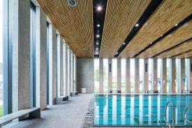 Beton je v Aplikačním centru BALUO použitý ve všech prostorách – ideální je jeho použití i v agresivním vlhkém prostředí bazénu, protože zde takový materiál nijak netrpí. Sedací lavice jsou také z betonu – od firmy Gravelli, která kromě různých bytových doplňků vyrábí z betonu i šperky. Další z materiálů uplatněných v tomto objektu je jednoznačně dřevo – jsou z něj vytvořené dřevěné vlny v hlavním koridoru kolem recepce, na stropě u bazénu a mnoha dalších částech.