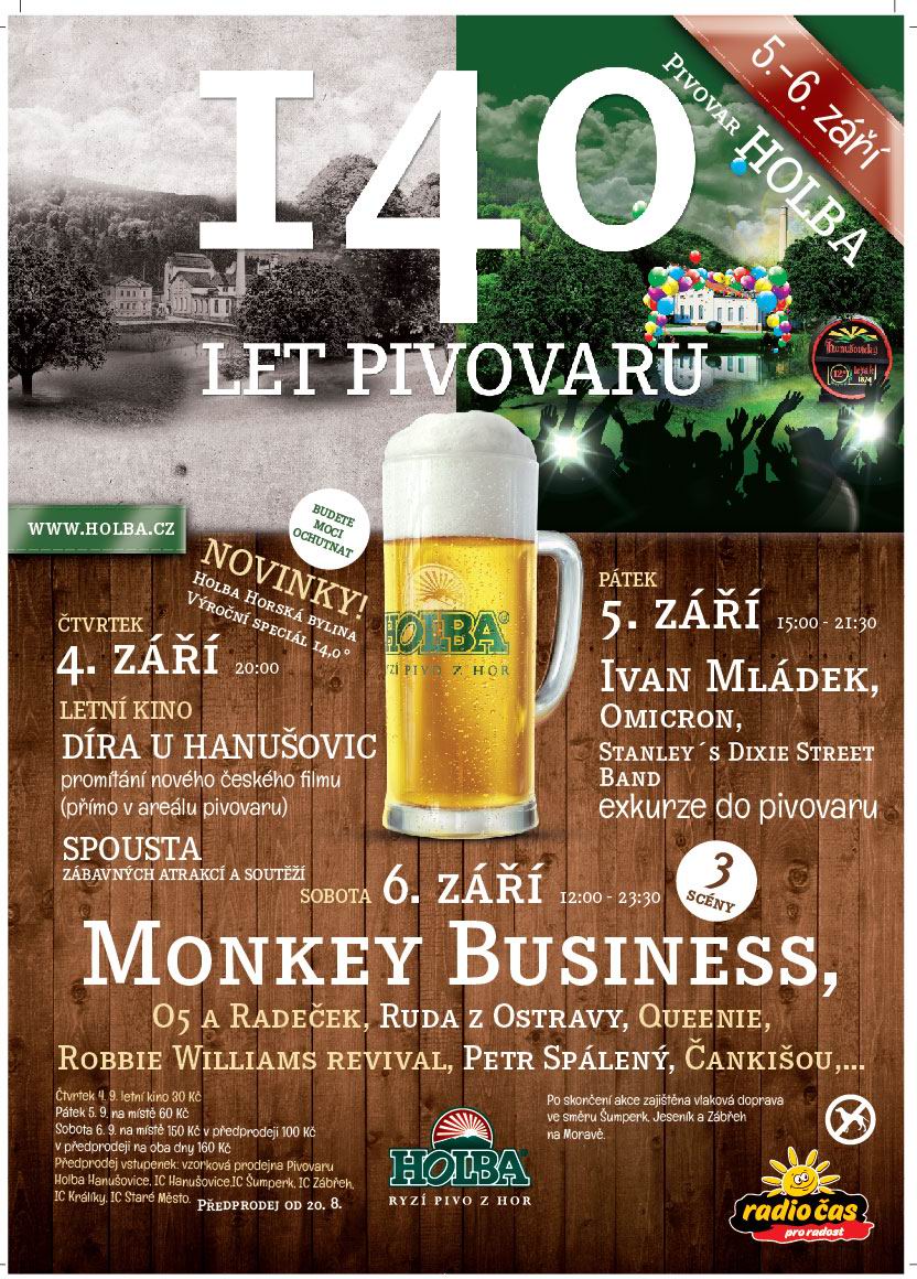 Sobotní oslavy oficiálně zahájí naražení soudku spojené s přípitkem Výročním speciálem 140. Hned poté hlavní scénu obsadí oblíbené kapely, tanečníci i Ruda z Ostravy a program vygraduje večerním vystoupením Monkey Business. Zábava je rozdělená do tří scén v areálu pivovaru. Nejvíce to bude vřít na hlavní stage, naopak nejklidněji bude u Pivovarského muzea. Pikniková louka u pivovaru ožije řadou atrakcí a dětským program, později tady zahraje Bludověnka a Zábřežský cimbál. Areál pivovaru se v sobotu otevře od 12 hodin a hned půl hodiny poté začne program. Slavnostní zahájení, spojené s naražením soudku s Výročním speciálem 140 pak proběhne v 15.45 hodin. Slavnosti ukončí 23.15 slavnostní ohňostroj. Pro návštěvníky oslav je zajištěna mimořádná vlaková doprava ve směrech Šumperk, Jeseník i Zábřeh na Moravě.