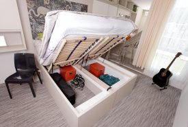 „Jednotlivé ,lodní kóje‘ mají zhruba 21 m2, což je relativně málo. Proto jsme povolali do zbraně designerku Lucii Malárovou, která se musela poprat se zadáním, aby se do pokojů vlezly: dvoje lyže, dvě prkna, kolečkové brusle, čtyři helmy... Zkrátka aby vzniklo hodně úložných prostorů. Zároveň se myslelo i na to, aby se člověk mohl nastěhovat pouze s kufrem. Najdete zde tedy veškeré vybavení: ledničku (větší než hotelovou), indukční vařič, mikrovlnku, varnou konvici, příbory, talíře i hrnce,“ vyjmenovává Marek Novotný.