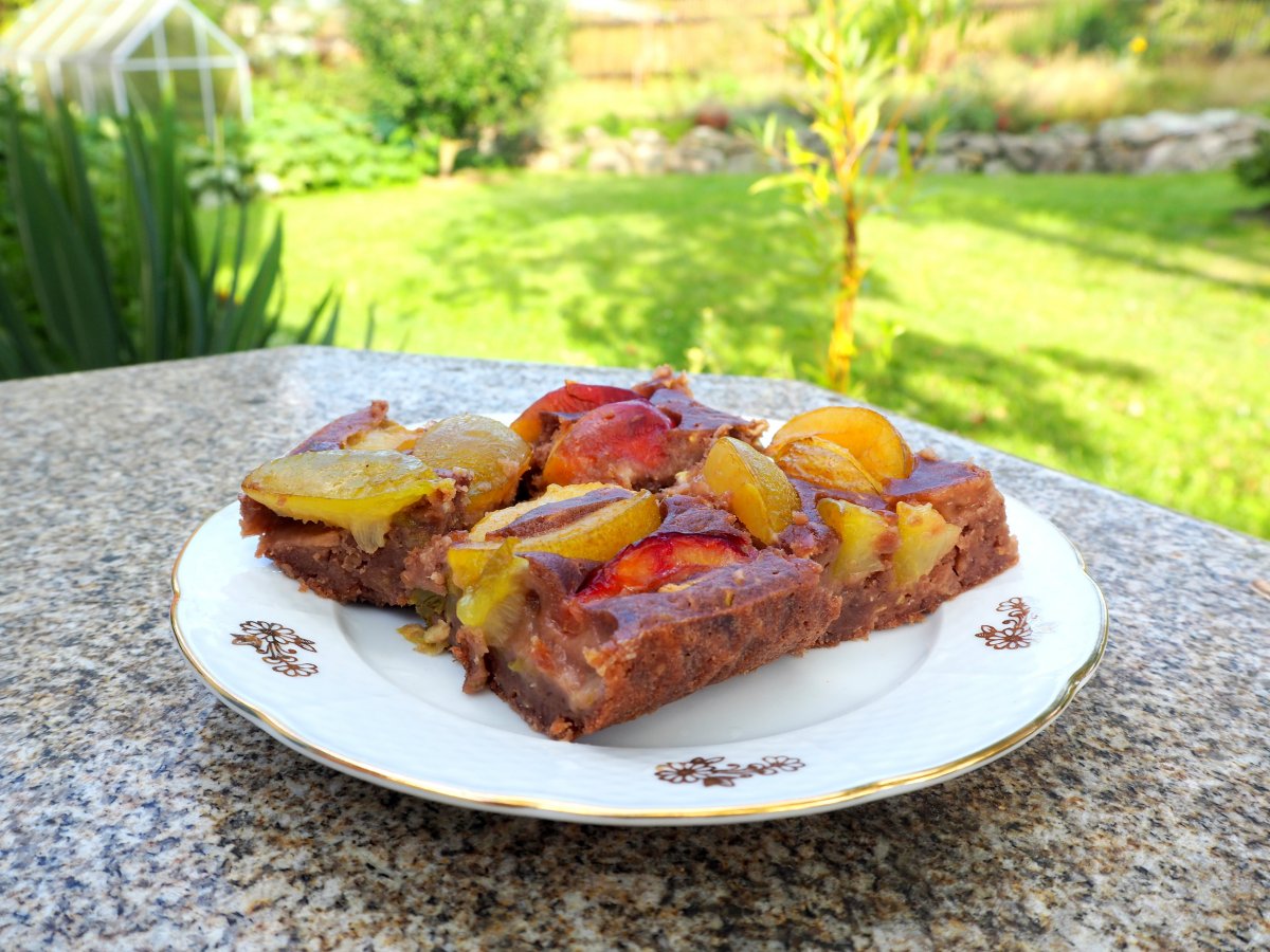 Všechny suroviny smíchejte ve velké míse, pokud je těsto příliš tuhé, nařeďte jej vlažnou vodou. Do plechu vložte pečící papír a poté do něj vlijte připravenou směs. Na povrch těsta poskládejte na čtvrtky rozkrájené blumy. Buchtu pečte v rozpálené troubě na 180 °C zhruba 30 až 40 minut.
