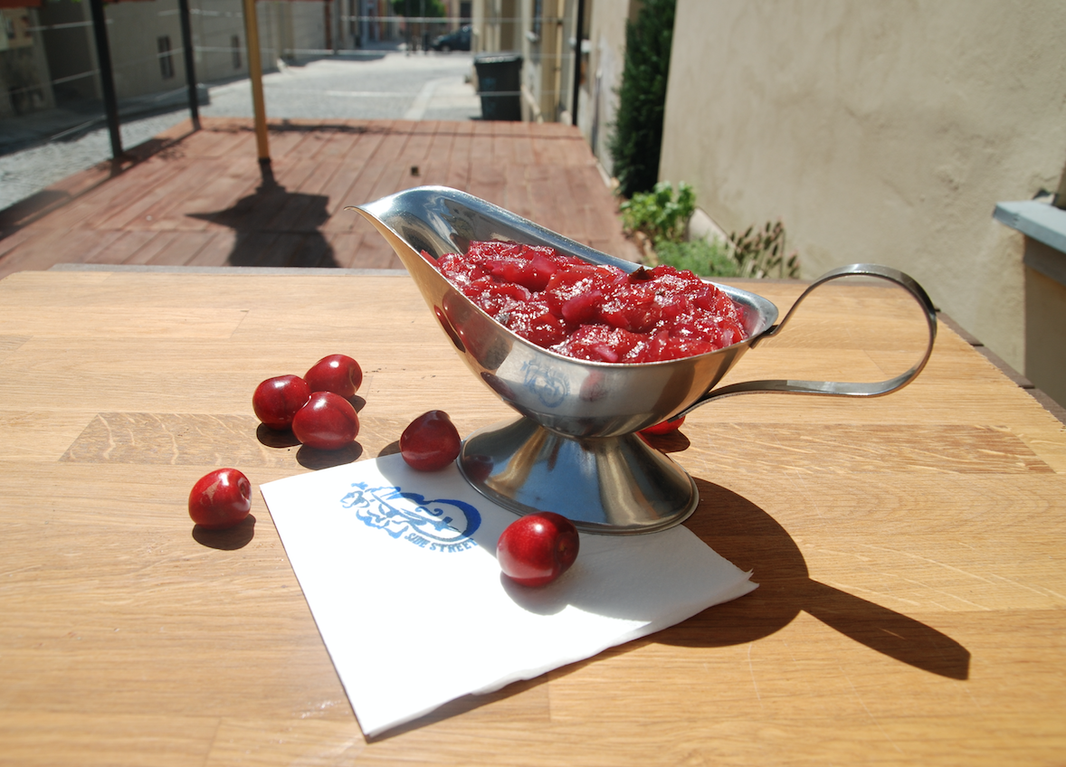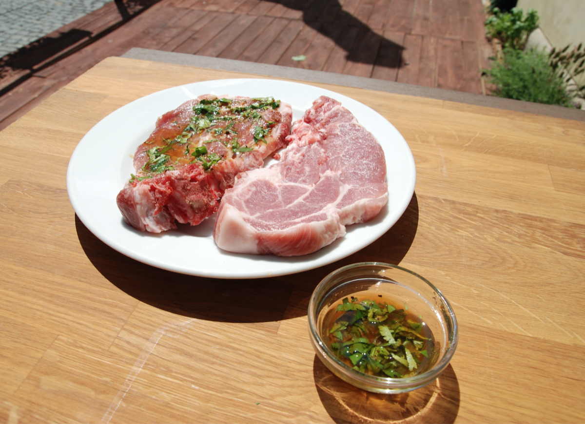 Plátky vepřové krkovičky lehce naklepte, osolte a opepřete. Potřete marinádou z bylinek – tu si připravte z nadrobno nasekaných bylinek, česneku a olivového oleje. Nechte odležet v lednici, nejlépe přes noc. Pokud vás však tlačí čas, stačí po dobu přípravy třešňového chutney.