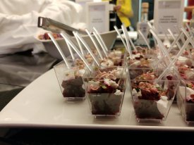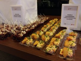 Na své si také přišli všichni gurmáni a milovníci dobrého jídla. V prostoru před sálem Evropa a v restauraci Sal de Mar mohli hosté ochutnat vyšperkované menu šéfkuchaře hotelu NH Collection Olomouc Congress Miroslava Fojtíka. To nabízelo například pečenou kachnu s variací zelí a knedlíků, vepřovou panenku se švestkovou omáčkou či pstruha na kmíně. Na malý hlad tu bylo několik chuťovek, třeba medová červená řepa s kozím sýrem, husí jatýrka na cibulce nebo škvarková pomazánka. Všude okolo na nás volaly tácy plné moravských sýrů či dezertů vyrobených v hotelové cukrárně.
