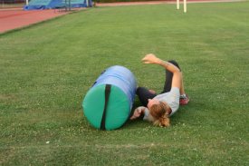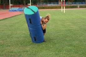 Potom mě Phil učil, jak mám „skočit“ na potenciální soupeřku v podobě tréninkového válce. Co vám budu povídat... První test nedopadl moc dobře (přece jen už mi není dvacet), ale pak se mi to tolik zalíbilo, že si dokážu představit, že by se rugby stalo jedním z mých oblíbených koníčků! Je to tak se vším – když správně víte, jak to dělat, hned vám to jde lépe!