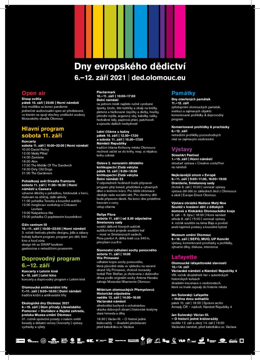 Koncerty v letním kině, tematické komentované prohlídky a procházky městem nebo Street Art Festival, divadelní představení pro děti i dospělé, akce Oživ centrum, Ekologické dny Olomouc, historické odpoledne věnované Přemyslovcům, pieta za oběti covidu... Dny evropského dědictví nabídnou vskutku bohatý program, v němž si vybere snad každý. Kompletní program naleznete na webu.