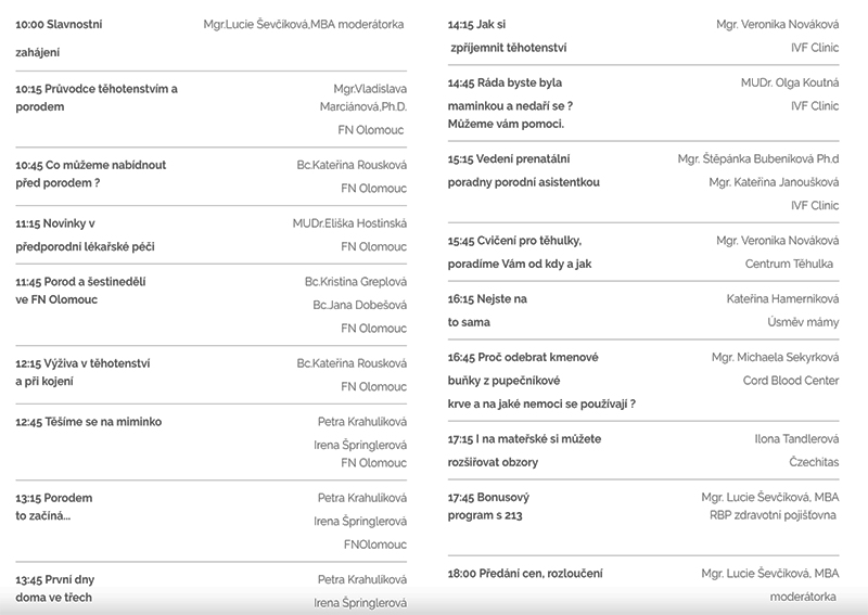 Festival je den nabitý programem přednášek. Představí se vám celá řada uznávaných osobností z řad lékařů, porodních asistentek, dul, fyzioterapeutů, odborníků přes přírodní kosmetiku a zdravé stravování. Hlavní cílem akce je uspokojit všechny budoucí maminky, které touží pochytit nové poznatky z oblasti gynekologie, porodnictví a zdravého životního stylu.