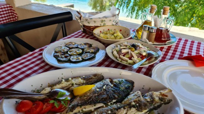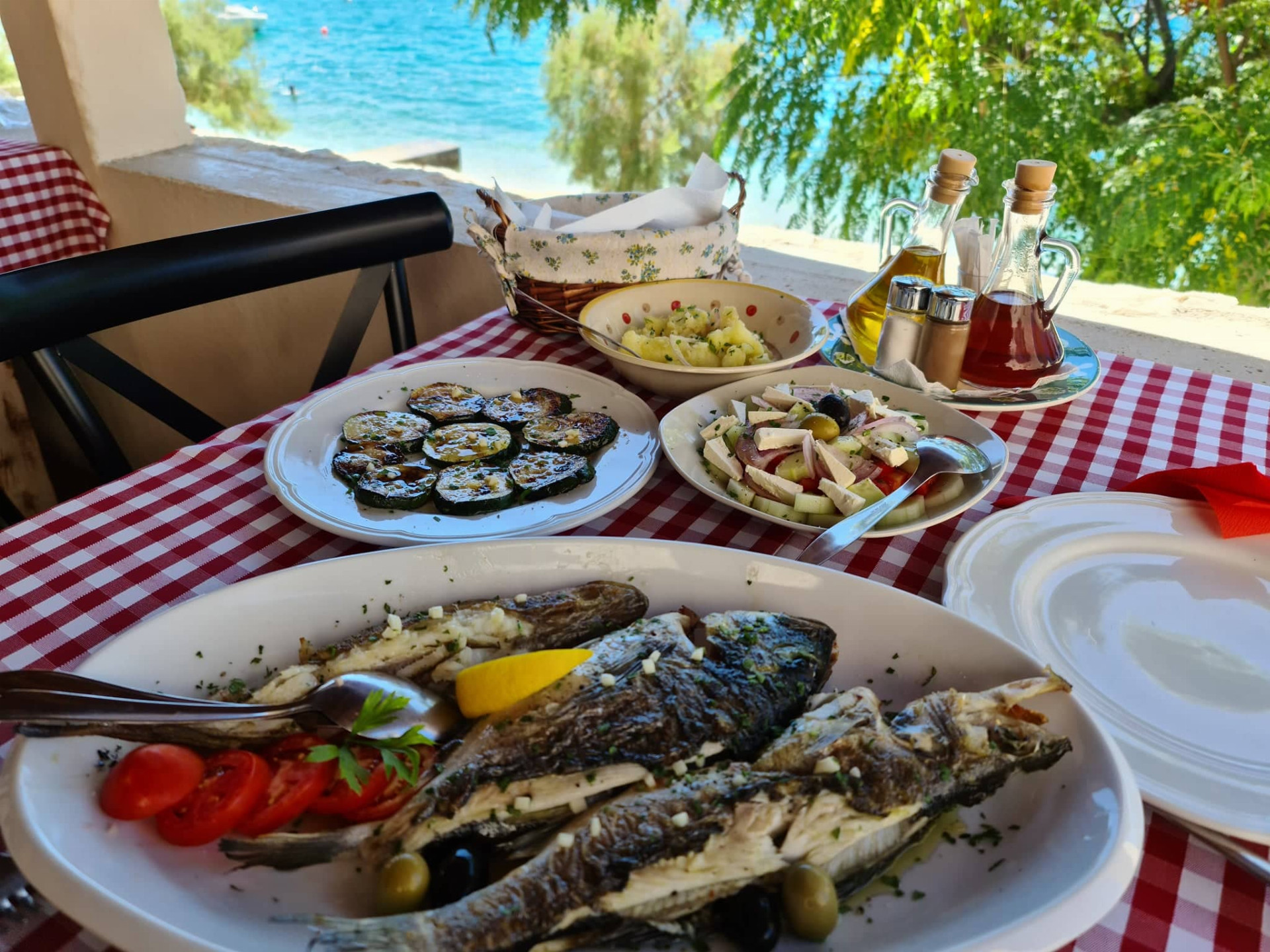 Dopřejte si rybí talíř pro dva. Najdete na něm tři druhy ryb, to vše zalité fantastickým olivovým olejem, doplněné olivami, bylinkami, čerstvou zeleninou i opečenou cuketou s česnekem. K jídlu se podává domácí chléb a chipsy z brambor z vlastní zahrádky, které si ale dle libosti můžete vyměnit za zeleninový salát. Ta chuť se nedá popsat, ta se musí zažít. Za nás nejlepší ryby široko daleko. A možná ty nejlepší, jaké jsme kdy jedli.
