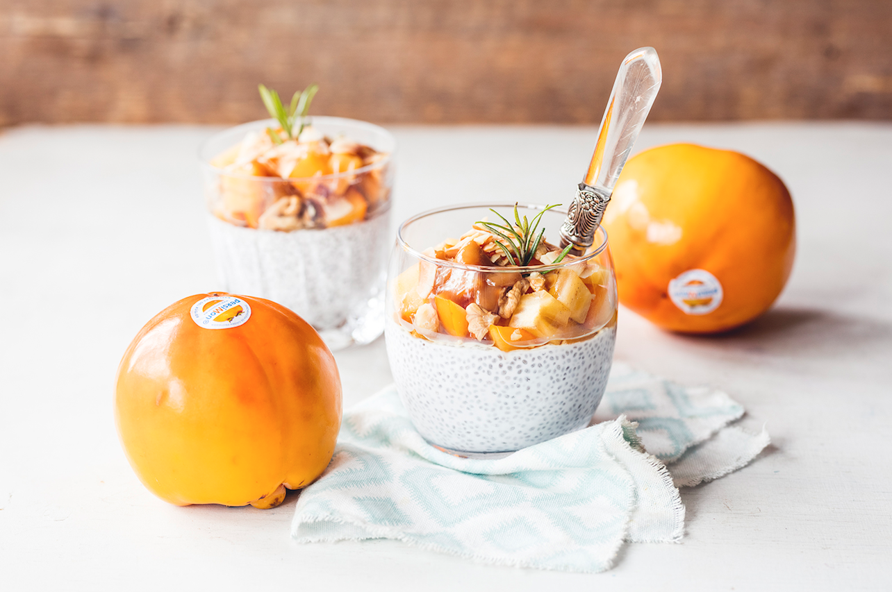 Chia semínka smíchejte s kokosovým mlékem, rozlijte do sklenic a nechte odstát. Semínka postupně nabobtnají a vytvoří puding. Mezitím si můžete nakrájet kaki a připravit slaný karamel tak, že rozpustíte třtinový cukr, který zalijete lehce mlékem nebo kokosovou smetanou a jemně osolíte. Nakrájené kaki navrstvěte na puding, zalijte slaným karamelem, posypte ořechy, ozdobte kokosem a můžete podávat.